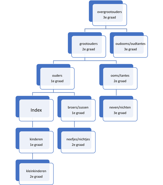 Om te bepalen of een patiënt in aanmerking komt voor DNA-onderzoek kan het belangrijk zijn om te weten wat 1e, 2e en 3e graads verwanten zijn binnen de genetica. Hieronder kunt u een overzicht vinden.